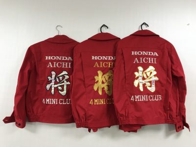 AICHI 将 4MINI CLUB様より持ち込みブルゾン刺繍のご依頼を頂きました。七色に光る生地を使用しました。この生地を使うと集合写真などの撮影で目立ちます。